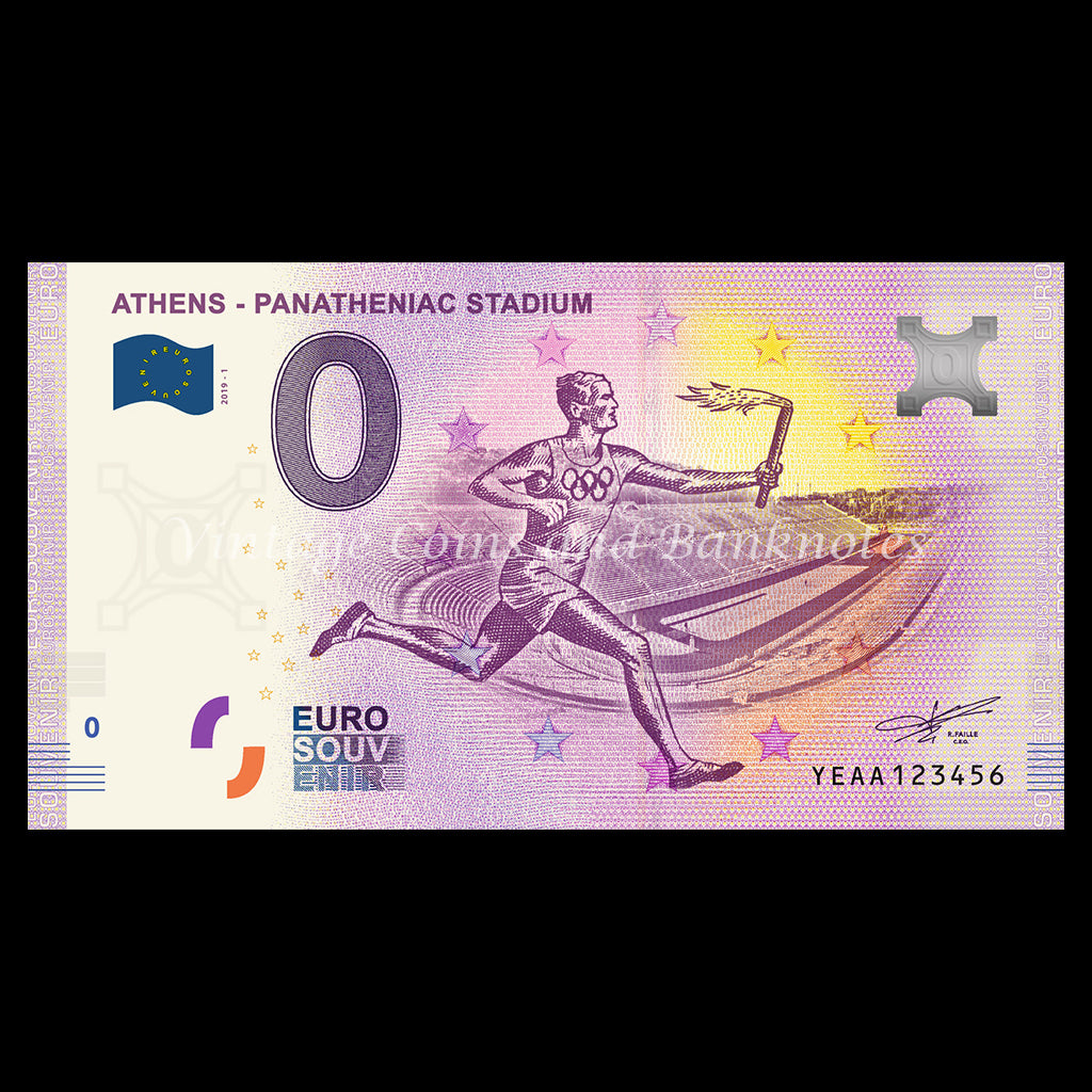 The first 0 euro souvenir banknote of Greece featuring the Panathenaic Stadium in Athens with the Olympic torch runner. Limited edition: 10.000 pieces. Design: Christian David Petermann.