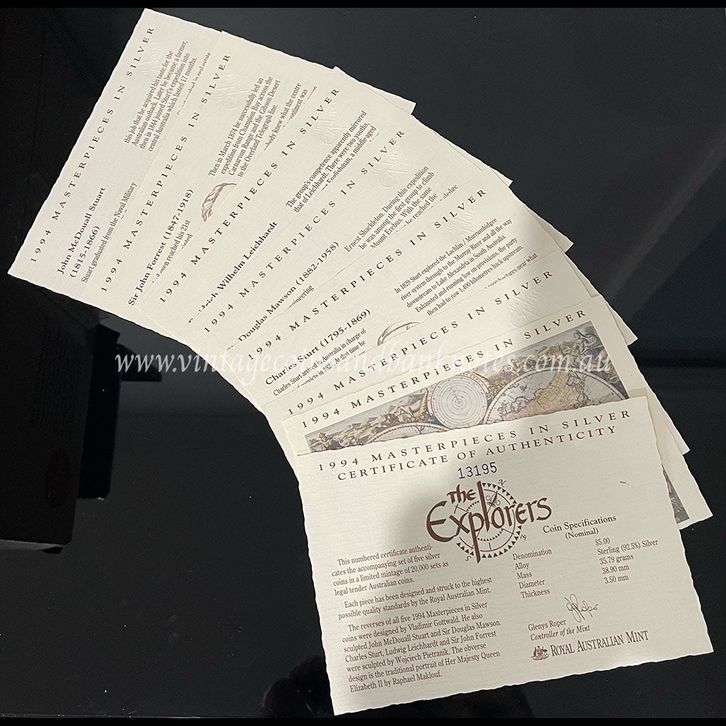 1995 $5 Masterpieces in Sterling Silver 5 Coin Set - Colonial Australia Condition: Proof silver coins in leather box with certificate. Outer box has some rips. Leather box has been...